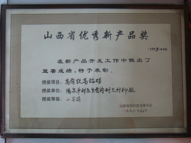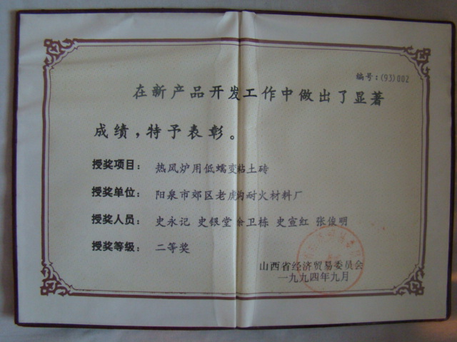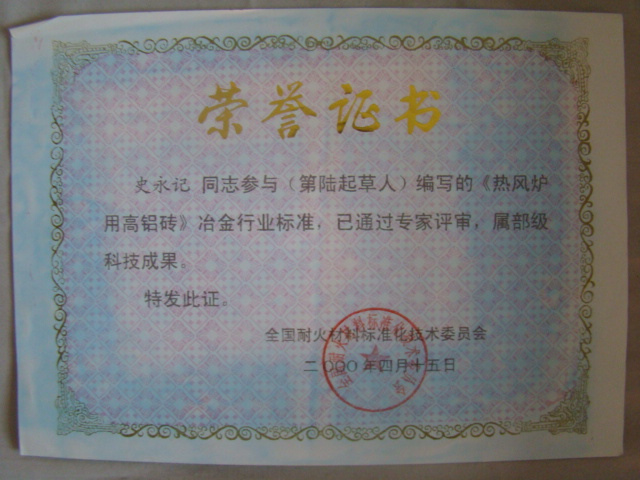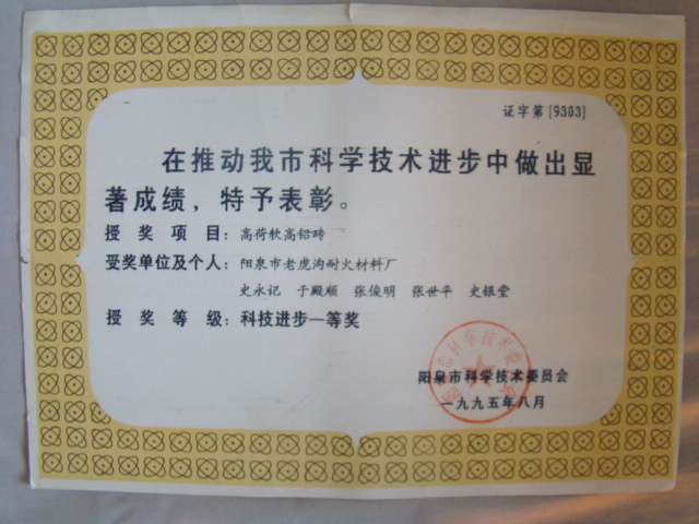 熱風(fēng)爐用低蠕變高鋁磚、高荷軟高鋁磚獲省科技進(jìn)步二等獎(jiǎng),微膨脹高鋁磚列入火炬計(jì)劃項(xiàng)目,炭素焙燒爐用特種高鋁磚已批準(zhǔn)國家專利
